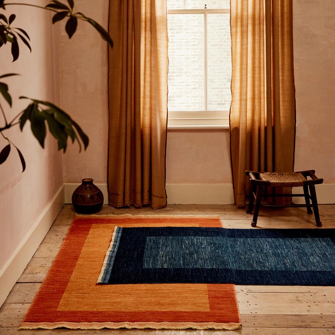 Each flatweave rug is made from fine Ghazni wool, a type of wool unique to Afghanistan owing to its terrain and climate. Every strand is spun and dyed by hand. The majority of our colours come from natural dyes extracted from locally found flowers, bark and roots. Ghazni wool is famously hardwearing and absorbs dyes organically, giving each Afghan rug a unique patina and mottled finish known as abrash.
