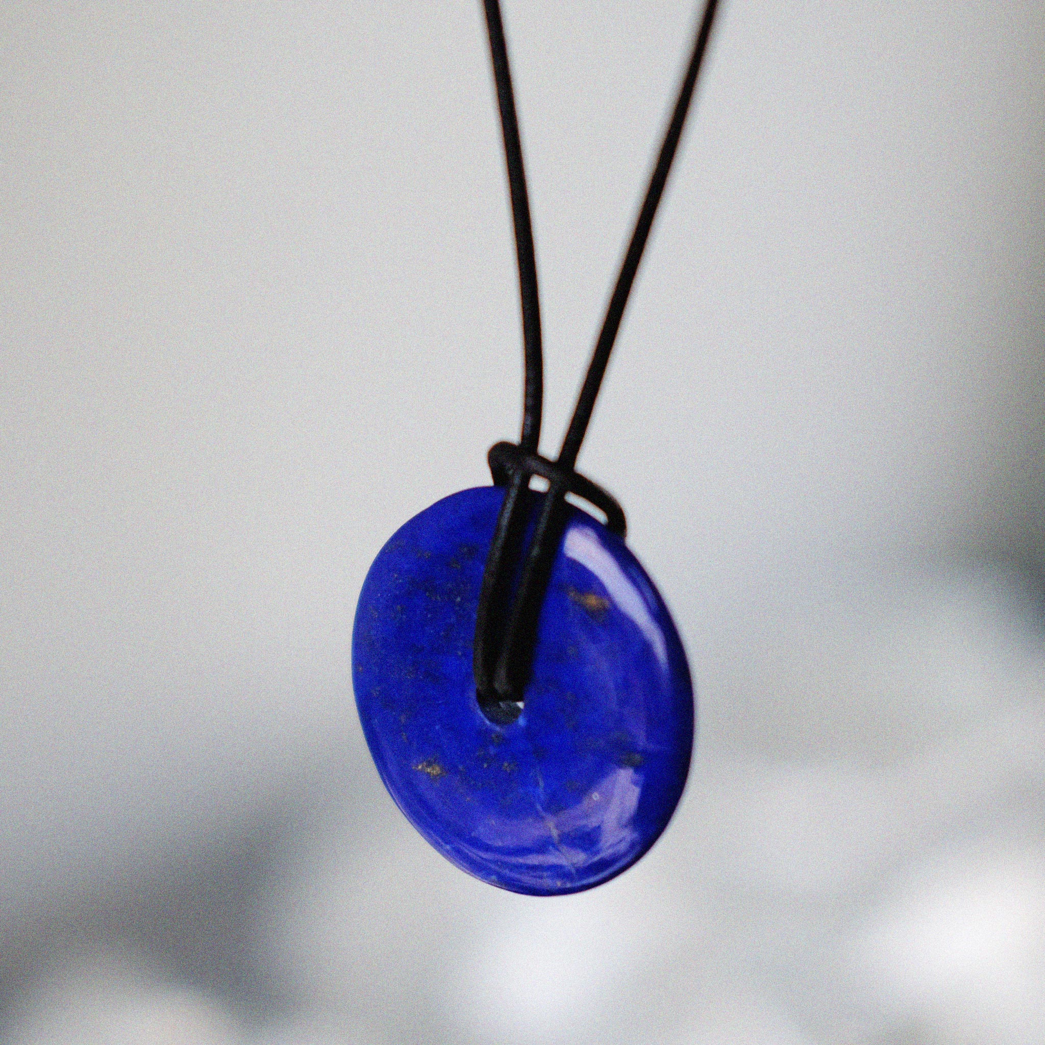 Part of our Cosmos Collection, the Mahtāb Pendant - meaning moonlight - features a large Lapis Lazuli disc on an adjustable black leather cord with silver caps. With a distinct focus on the deep blue colour of the lapis, this pendant works well layered with other necklaces or worn alone.