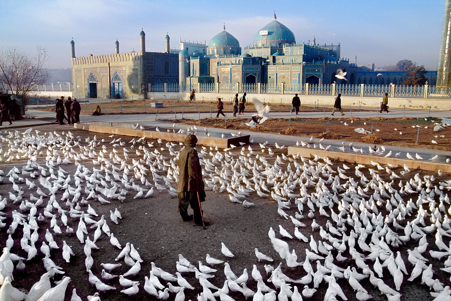 "A man stands in the middle of a flock of doves at the Hazrat Ali Mosque. Legend has it that the doves are pure white because of the sanctity of the shrine, and that if a dove with a speck of colour flies in and stays, it too will turn white as snow."- Steve McCurry