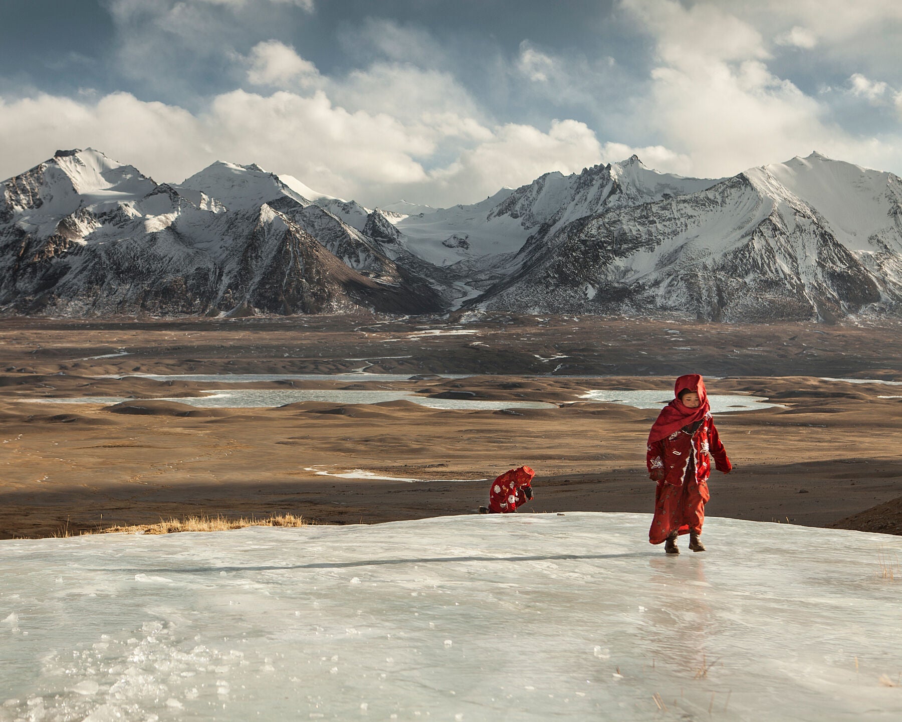 "Two young Kyrgyz girls walk up a frozen river to fetch water at the spring on the edge of camp in Ech Keli camp, Afghan Pamir. It was my second winter expedition into Afghanistan’s Pamir mountains. A five-week assignment in rough conditions and extreme cold. We trekked for three weeks, working on a film documentary on the isolated Kyrgyz community." - Matthieu Paley