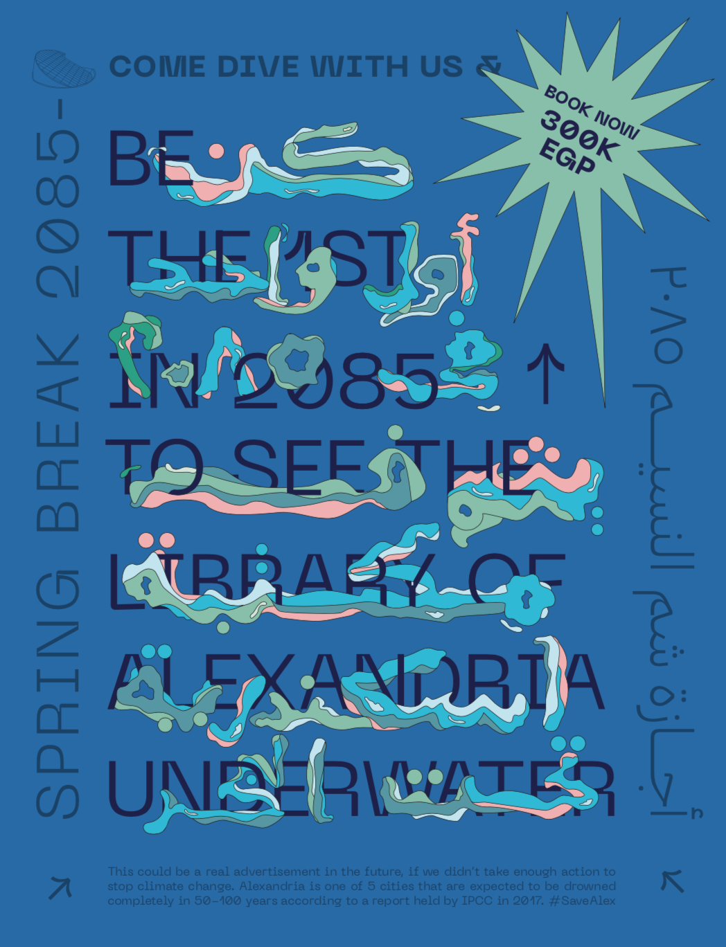 Nora Aly is a Egyptian graphic designer from Alexandria - a city greatly threatened by global warming and rising sea levels. For My Mark: My City, Nora designed a tongue-in-cheek series of posters promoting the first diving trips to the drowned city of Alexandria in 2085. The posters invited viewers to consider the real possibility of this happening, and started conversations that played out on the streets of Alexandria between members of the public and Nora.
